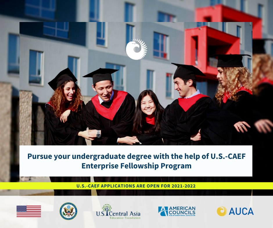 Be one of future leaders of Central Asia with exceptional degree from AUCA. American University in Central Asia provides students with a hands-on educational experience as they work towards completing their bachelor's degree to enter job market with most up-to-date career qualifications. US-CAEF scholarship assists fellows in duration of studies which makes it an intensive four-year curriculum consisting by focusing in such majors as: Business Administration, Economics, Applied Mathematics and Informatics and Software Engineering, respectively. This unique enterprise fellowship brings participants closer together after graduation through alumni reunion events to strengthen networking.