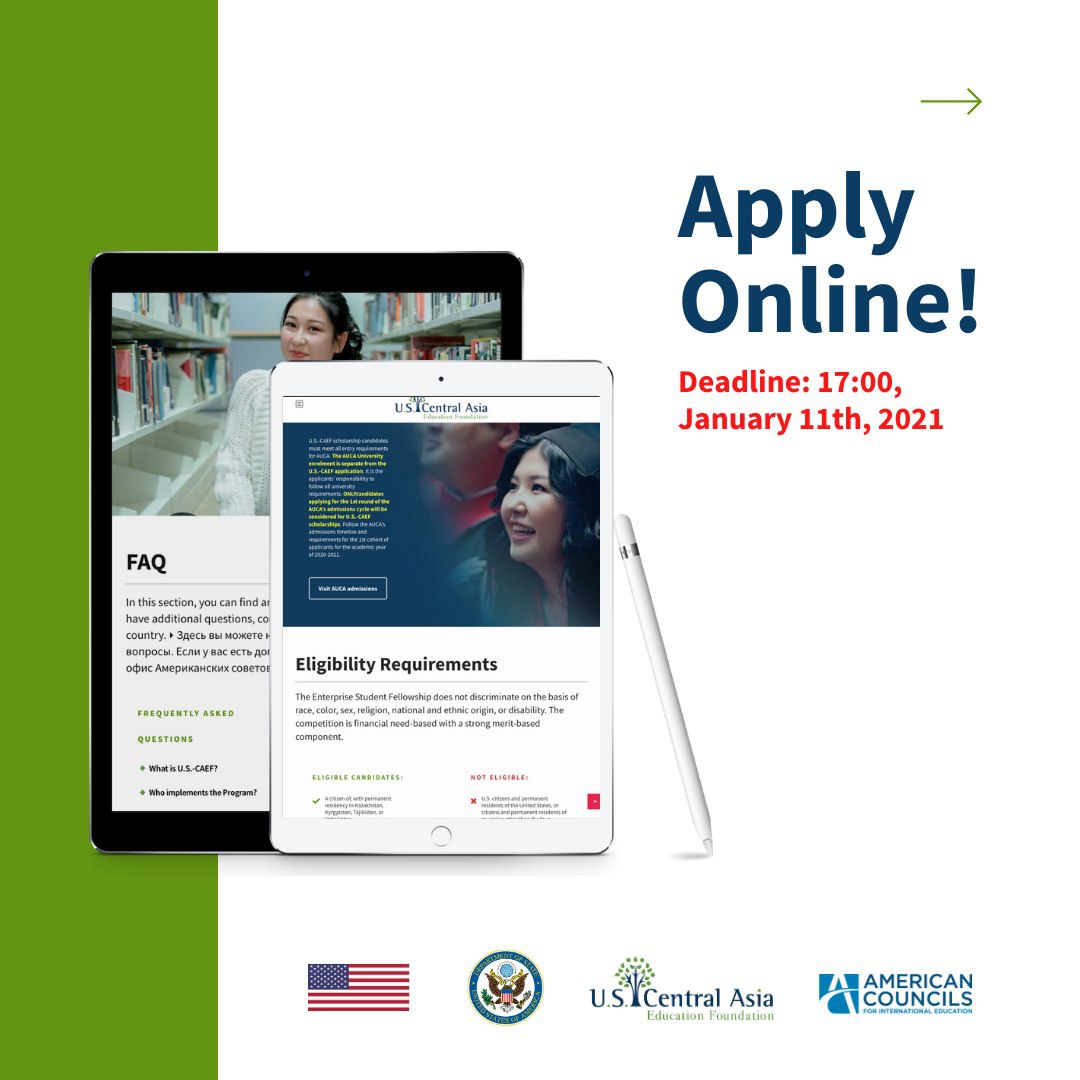 Be one of future leaders of Central Asia with exceptional degree from AUCA. American University in Central Asia provides students with a hands-on educational experience as they work towards completing their bachelor's degree to enter job market with most up-to-date career qualifications. US-CAEF scholarship assists fellows in duration of studies which makes it an intensive four-year curriculum consisting by focusing in such majors as: Business Administration, Economics, Applied Mathematics and Informatics and Software Engineering, respectively. This unique enterprise fellowship brings participants closer together after graduation through alumni reunion events to strengthen networking.