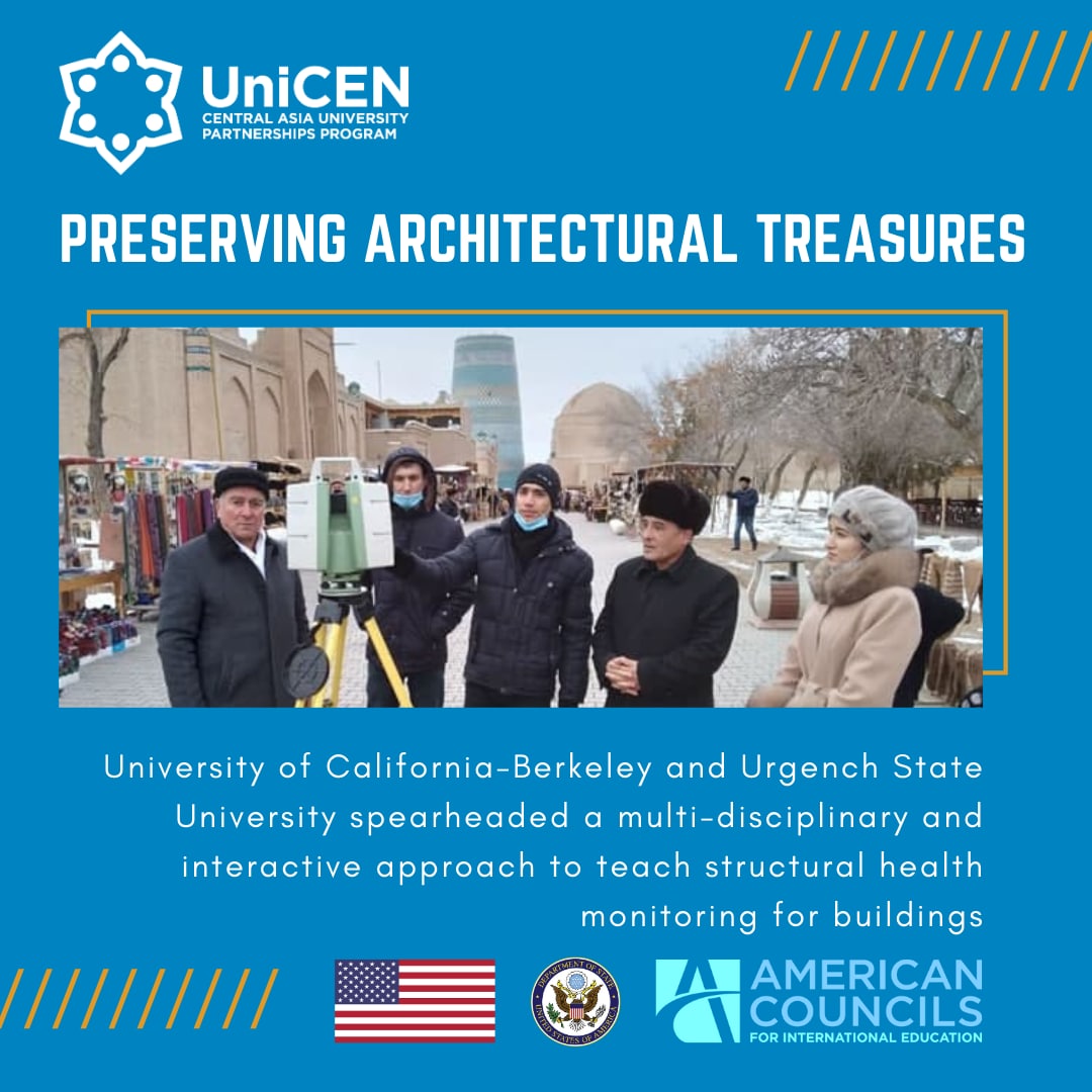 Known for its ancient historical treasures, Uzbekistan’s tourism sector is rapidly growing as the country continues to open doors for foreign travelers. Preserving and maintaining historical landmarks is essential to ensure that future generations enjoy Uzbekistan’s architectural splendor. Through the Central Asia University Partnerships Program (UniCEN), researchers at the University of California-Berkeley and Urgench State University spearheaded a multi-disciplinary and interactive approach to teach structural health monitoring for buildings.