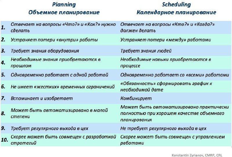 10 отличий между объемным и календарным планированием в #ТОиР (#Planning и #Scheduling)