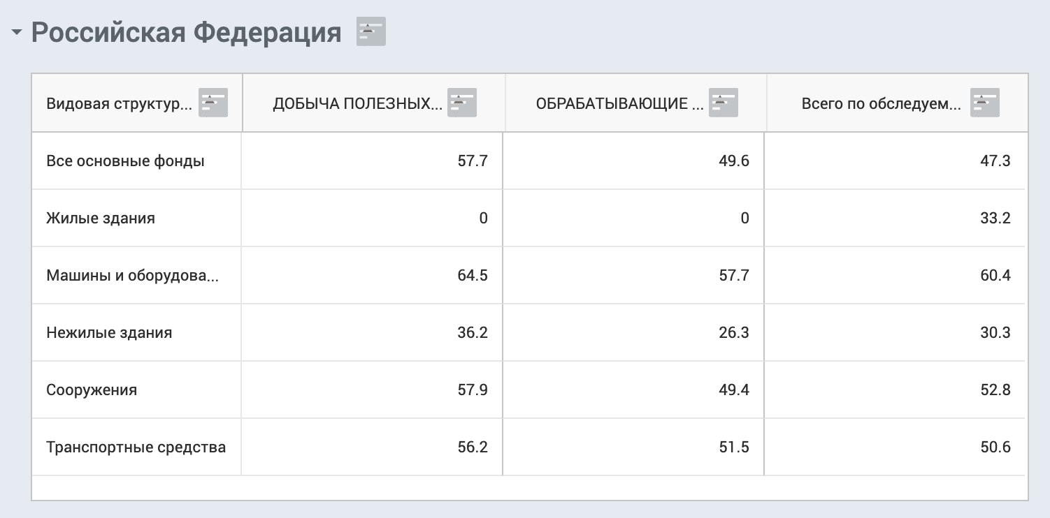 А там мы нашли показатель "Степень износа основных фондов" ( отношение накопленного к определенной дате износа имеющихся основных фондов (разницы их полной учетной и остаточной балансовой стоимости) к полной учетной стоимости этих основных фондов на ту же дату, в процентах) и много другого интересного..