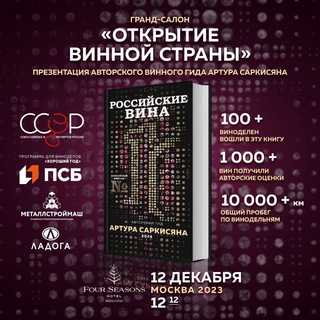 Купите билеты на событие: Презентация 10-го юбилейного авторского гида «Российские вина 2024» Артура Саркисяна и Гранд-салона "Открытие винной страны", 12 декабря 2023, 10:00–19:00 (Москва, Four Seasons Hotel Moscow, Охотный ряд, 2)