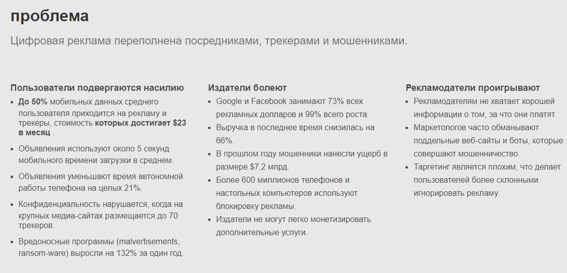 Почти все свои деньги Google заработала на рекламе. Но по словам аналитиков этот бизнес перестал процветать, как это было раньше. Возможно теперь пришло время для децентрализованных решений. Это экономит деньги рекламодателю и даёт возможность заработать именно потребителю рекламы. Это должно изменить рынок рекламы, так как порядка 70% от стоимости будет получать тот, кто её смотрит и порядка 30% тот кто её размещает.