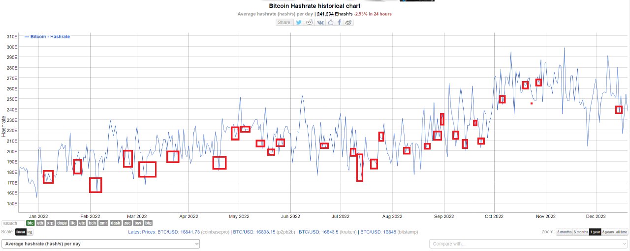 Было замечено, что после запусков некоторых спутников Старлинк, хешрейт сети биткойна немного подрастал. На графике под текстом красным отмечены запуски.