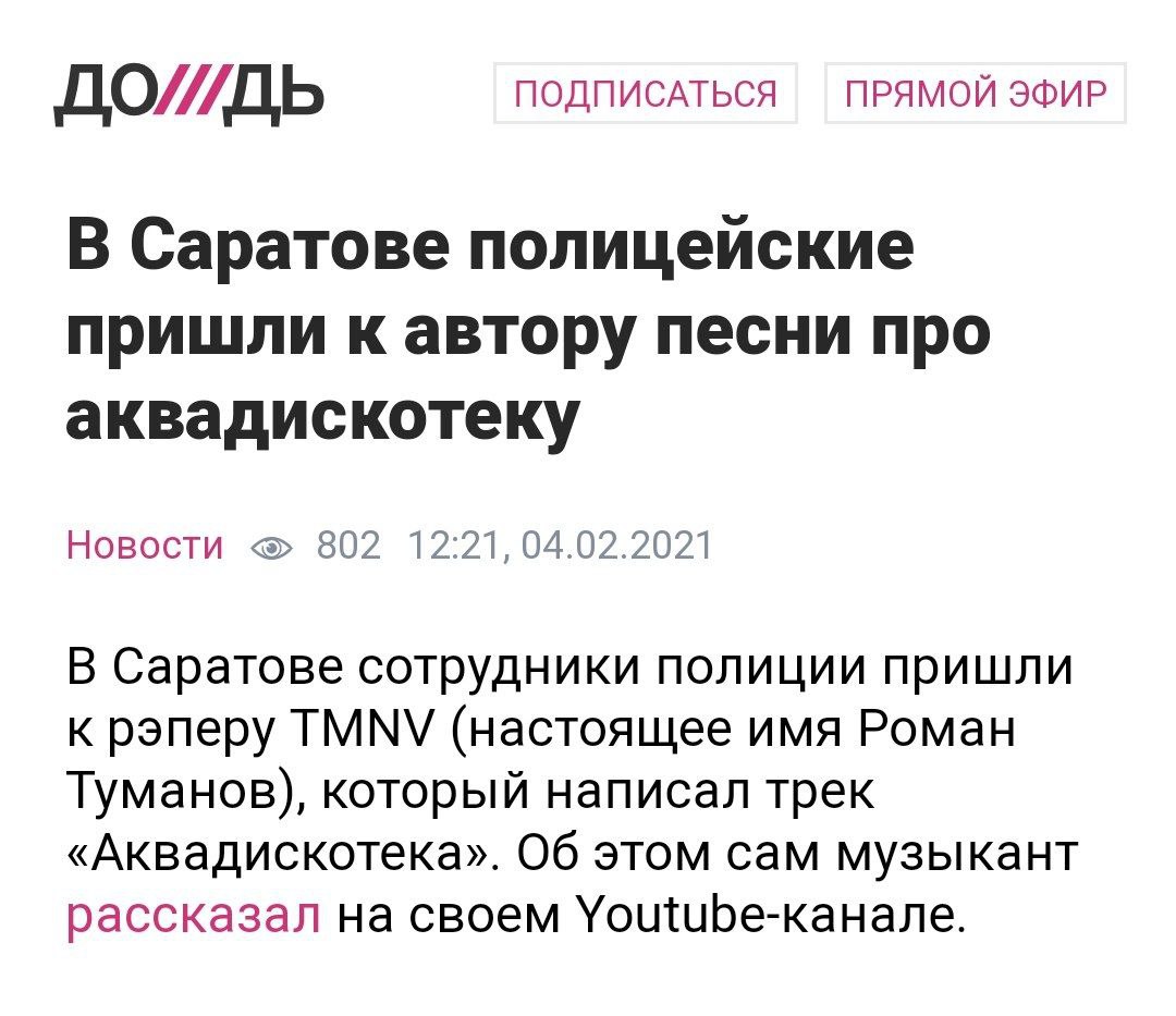 В Саратове полицейские пришли к рэперу TMNV — автору трека «Аквадискотека». Свой визит, по его словам, они объяснили тем,что 31 января музыкант участвовал в митинге в поддержку Навального.