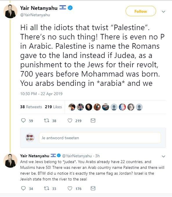 "Привет всем идиотам, которые пишут слово "Палестина". Не существует такого понятия. В арабском языке даже буквы "п" нет. Палестина - это название, которое римляне дали земле, называвшейся Иудея, в наказание евреям за их восстание за 700 лет до рождения пророка Мухаммеда" - написал сын премьера в одном твите.
