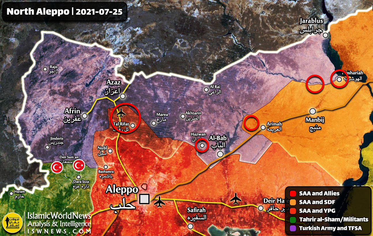 После нападения, турецкая артиллерия подвергла массированному обстрелу позиции сирийских курдов вдоль линии разграничения в провинции Алеппо: город Таль-Рифаат, посёлок Хазуан, авиабаза "Менах", город Манбидж, село Хошарийя и городок Аль-Арима.