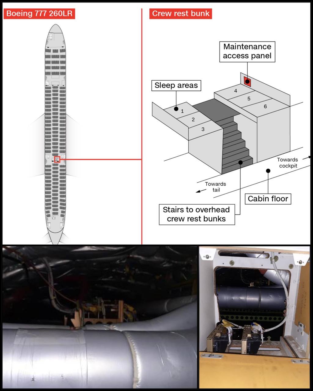 В салоне Boeing 777-200LR есть места для отдыха экипажа. Они находятся "под потолком" в середине салона самолёта. Получив доступ к панели обслуживания, двое сотрудников авиакомпании затем прорезали дыру в панели, чтобы суметь пробраться через нее в пространство между обшивкой и потолком самолёта. В этом месте они прятались более полутора суток.