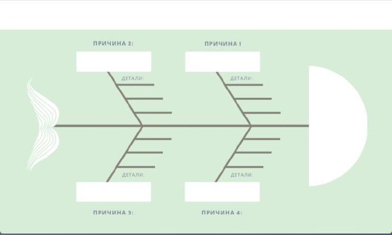 👉🏻 Диаграмма представляет собой горизонтальную линию (проблема), к которой прикрепляются стрелки сверху и снизу (факторы). К стрелкам могут прикрепляться дополнительные стрелки (фактор второго уровня) и т. д., то есть степень детализации диаграммы может быть различной. В итоге диаграмма напоминает скелет рыбы, поэтому её часто именно так и называют.