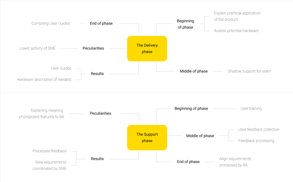 Support. During the Support stage, the work of the SME and the BA is mainly focused on handling requests and feedback from end-users. The expert will be able to explain tricky moments to workers and clearly convey the importance of a particular request to the team. The BA aligns requests with existing requirements, provides the customer with detailed estimates of changes, and manages possible changes of requirements.