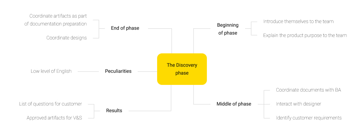At the start of the Discovery phase, the BA should introduce the SME to the team and give this specialist an opportunity to talk in simple words about the essence of the project and their vision of its implementation. In the course of Discovery, the BA can coordinate the prepared documentation with the SME and ensure their interaction with the designer to explain the features of the designed system and its convenience for users. The SME should also be involved in meetings with the customer or their expert for a more complete requirements elicitation based on domen specifics.