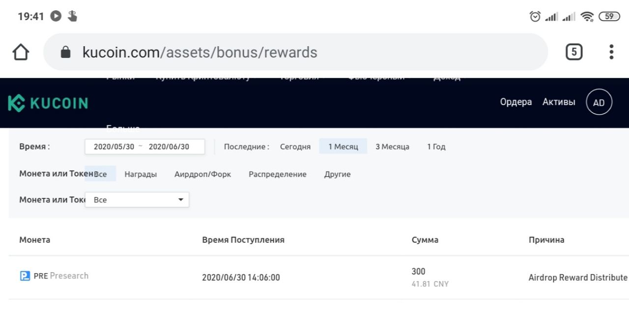 Получил 300 PRE по результатам вот этой раздачи от Presearch и KuCoin
