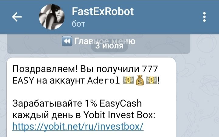 Что-то биржа Yobit зачастила с раздачами халявы. В том же боте, где вчера раздавали 1700+800 Free Dollars, теперь можно забрать ещё и 777 EasyCash и получать с них 1% ежедневно через Investbox.