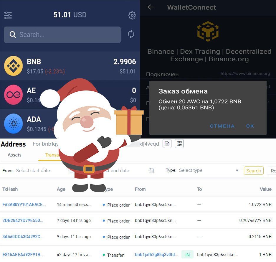 Получается, что чистый профит составил 1,99 BNB (34$ по текущему курсу). Было получено 15 AWC за регистрацию + 25 AWC за рефералов. Кстати, обменять их на BNB можно прямо в кошельке с помощью функции Wallet Connect (операции проводятся через Binance DEX, но по факту монеты не покидают кошелька).