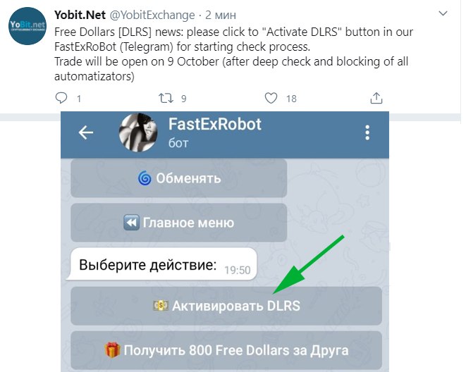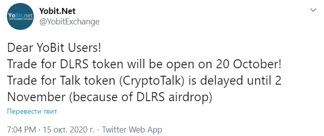 #YoBit наконец-то выкатил информацию по DLRS - в Твиттере биржи сказано, что торги начнутся 20 октября🤪