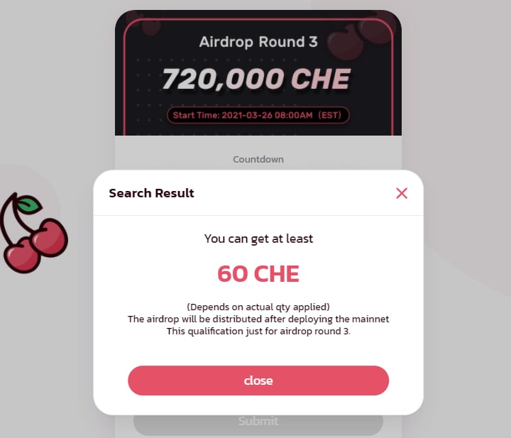 Если вы прошли, увидите уведомление, что получите минимум 60 CHE.