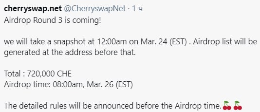 Появились условия участия в 3 раунде аирдропа CherrySwap