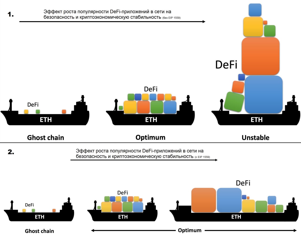 Важно запомнить, что ценность $ETH обеспечивает безопасность каждого процесса на Ethereum. Ethereum можно считать безопасным лишь в том случае, когда капитализация ETH сопоставима с капитализацией всех DeFi-приложений.