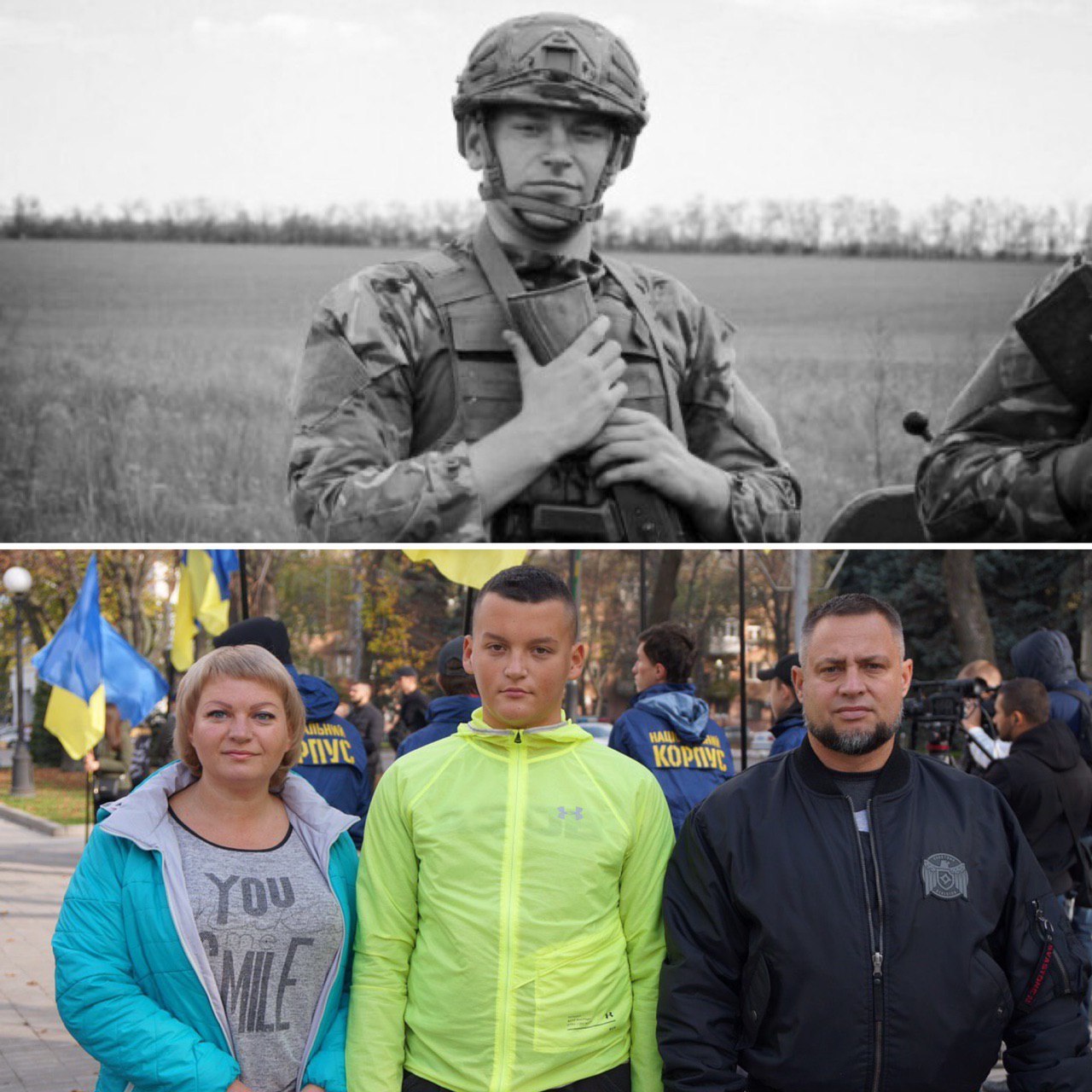 Декілька слів хочу сказати про сім‘ю Євгена. Його мати Тетяна і вітчим Віктор — волонтери, у 2014-му прихищали переселенців, а сьогодні очолюють осередок Національного Корпусу в рідному Вільногірську, в Дніпропетровській області. Від поїздки на війну мати Євгена відмовляти не стала, тільки просила закінчити навчання. Молодший брат Марк кожне літо проводить у нашому національно-патріотичному таборі «Азовець». Цього року поїде п‘ятий раз. Зараз навчається в 9 класі та мріє отримати військову освіту і стати військовим. За прикладом брата.