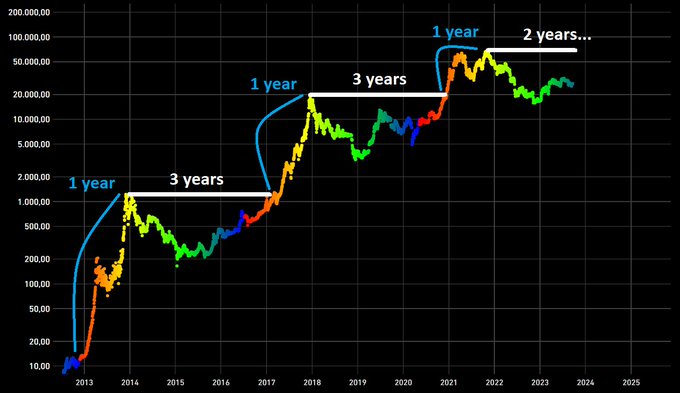 🚀 Каждые 3 года биткоин возвращается к своему последнему АТН, а затем за следующий год делает новый максимум