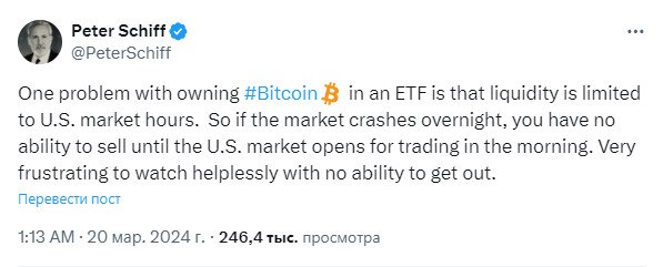 "Одна из проблем с владением биткоином в ETF заключается в том, что ликвидность ограничена рыночными часами в США. Таким образом, если рынок рухнет в одночасье, у вас не будет возможности продавать до тех пор, пока рынок США не откроется для торгов утром. Очень неприятно беспомощно наблюдать, не имея возможности выбраться"
