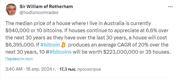 🧮 "Средняя цена дома, где я живу в Австралии, в настоящее время составляет $940 000 или 10 биткоинов. Если стоимость домов продолжит расти на уровне 6,6% в течение следующих 30 лет (как это было в последние 30 лет), дом будет стоить $6,395 млн. Если BTC обеспечит средний среднегодовой темп роста 20% в течение следующих 30 лет, то 10 BTC будут стоить $223 млн или 35 домов"
