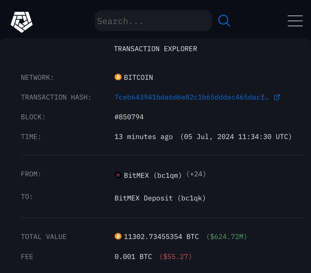 💰 Рынок переполошил перевод 11 302 BTC на $624,427 млн в одной транзакции