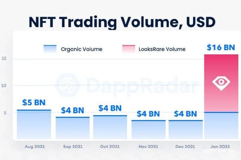 В то время как рынок криптовалют снижался на двузначные цифры по сравнению с его историческими максимумами, в январе рынок невзаимозаменяемых токенов (NFT) увеличился, даже без учета искусственных сделок, согласно поставщику информации о dapp (децентрализованном приложении) DappRadar.