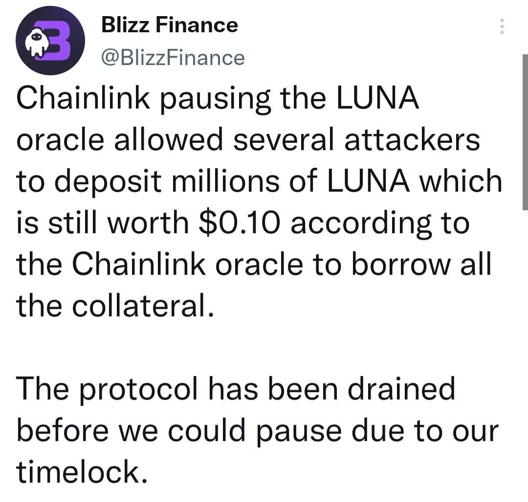 ⚡ Кредитный протокол на Avalanche Blizz Finance также понес убытки из-за приостановки обновлений Chainlink цен LUNA.