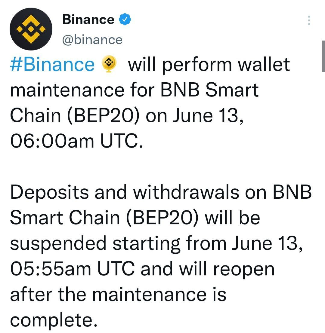 💎 Binance объявила, что проведёт техническое обслуживание кошелька для BNB Smart Chain (BEP20) 13 июня в 09:00 Мск.