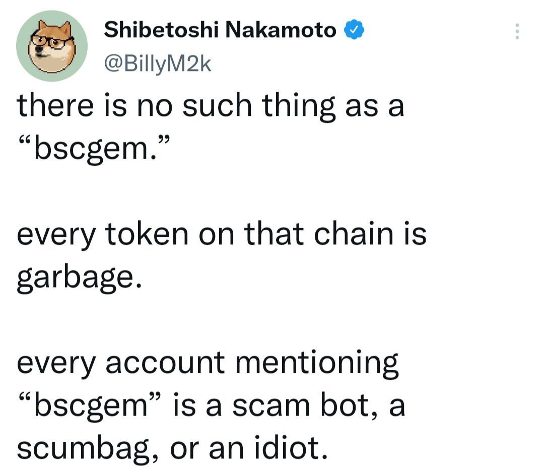 🔸 каждая учётная запись, в которой упоминается «bscgem», - мошеннический бот, отморозок или идиот".