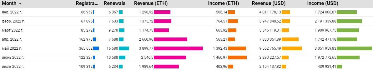 Только в воскресенье, 3 июля, было зарегистрировано 29 727 доменов ENS. Доход сервиса за этот день превысил $684 000 — более трети от общего показателя в $1,8 млн за период.