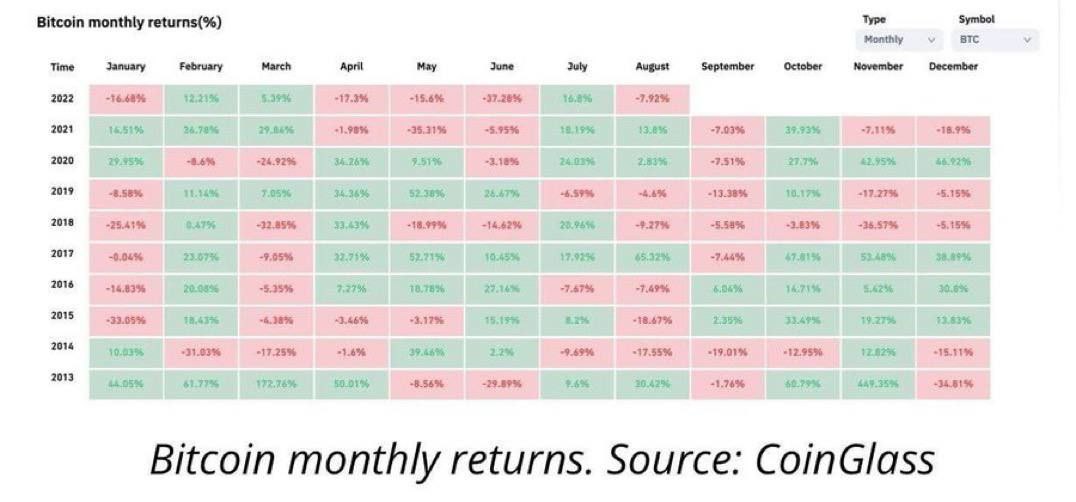 🧐 Исторически сложилось так, что сентябрь был худшим месяцем для биткоина с 2013 по 2021 год