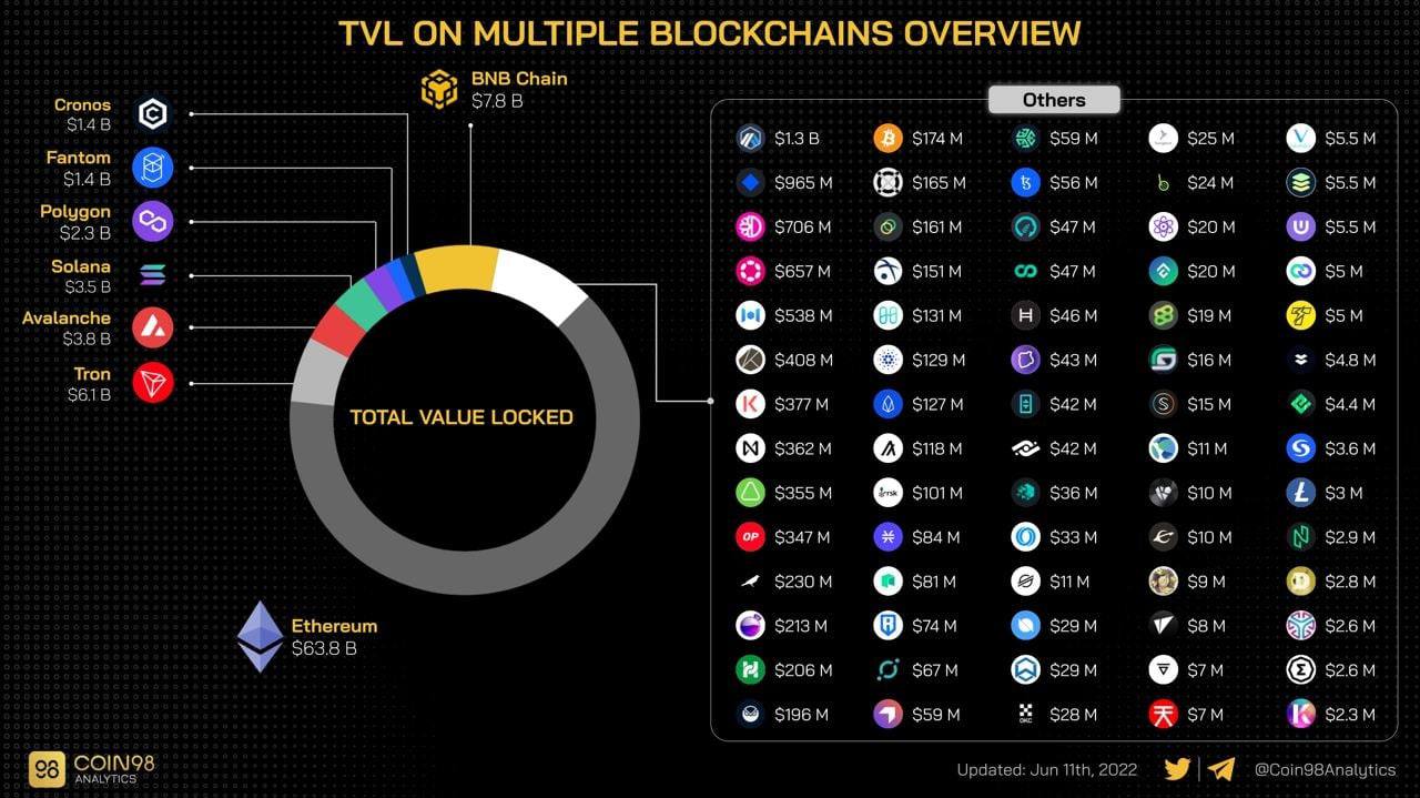 Сумма заблокированных средств (TVL) в различных блокчейнах.