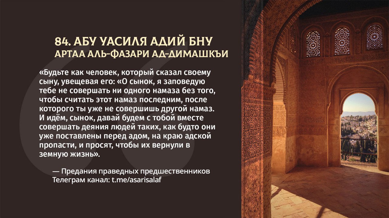✅«Будьте как человек, который сказал своему сыну, увещевая его: «О сынок, я заповедую тебе не совершать ни одного намаза без того, чтобы считать этот намаз последним, после которого ты уже не совершишь другой намаз. И идём, сынок, давай будем с тобой вместе совершать деяния людей таких, как будто они уже поставлены перед адом, на краю адской пропасти, и просят, чтобы их вернули в земную жизнь»