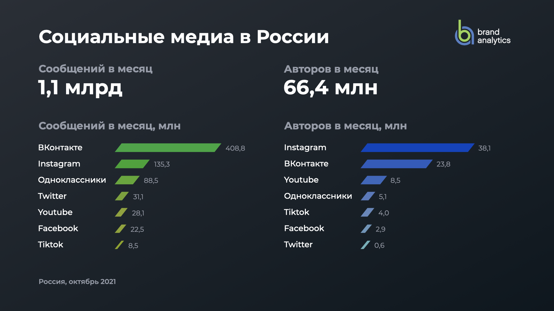 ⚡️ В октябре 2021 года число активных авторов в социальных медиа в России составило 66,4 млн. Авторы написали более 1,1 млрд публичных сообщений (постов, репостов и комментариев).