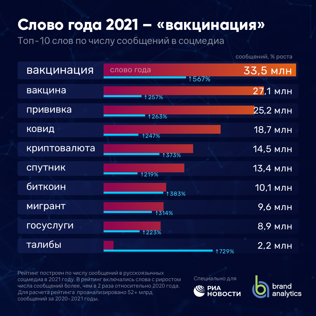 💥Словом 2021 года в русскоязычном соцмедиа стала вакцинация – его упомянули в 33,5 млн сообщений. Это почти в 6 раз чаще, чем в 2020 году.