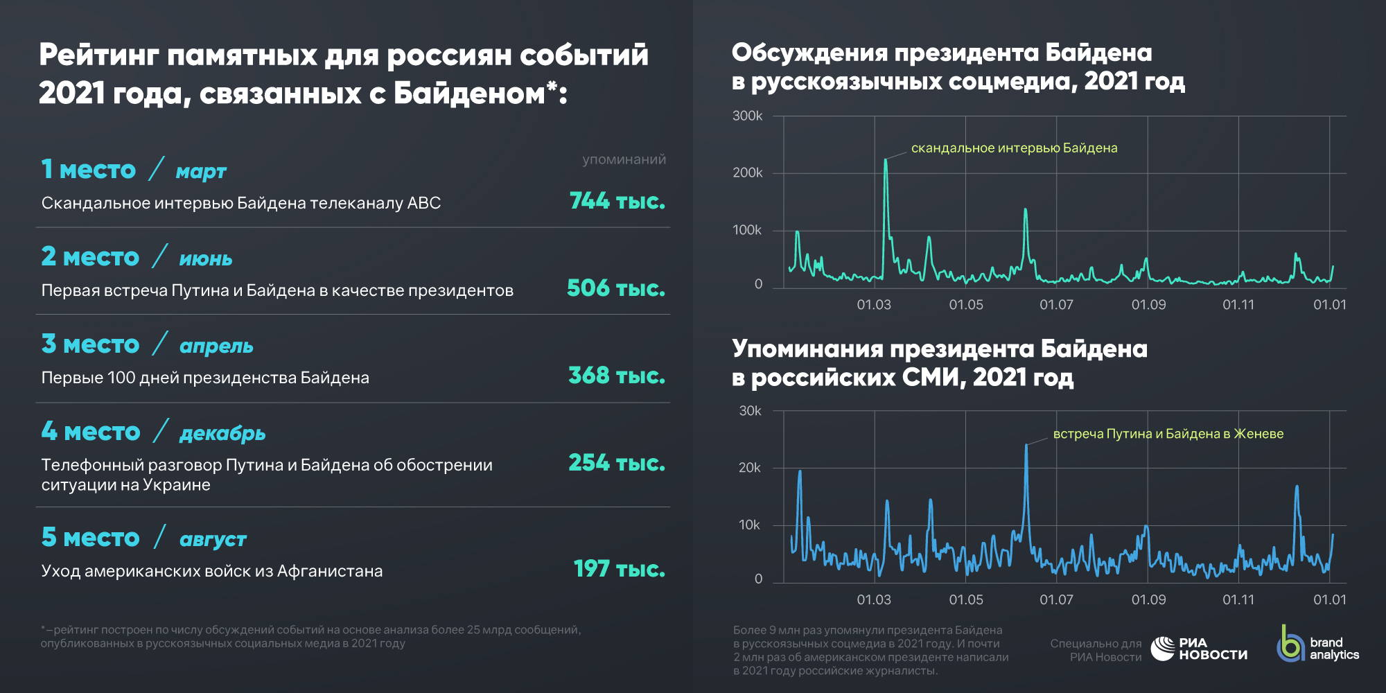 По итогам первого года президентства Джо Байдена Brand Analytics проанализировали, какие события, связанные с американским президентом, больше всего обсуждались пользователями в русскоязычных социальных медиа и журналистами в СМИ.