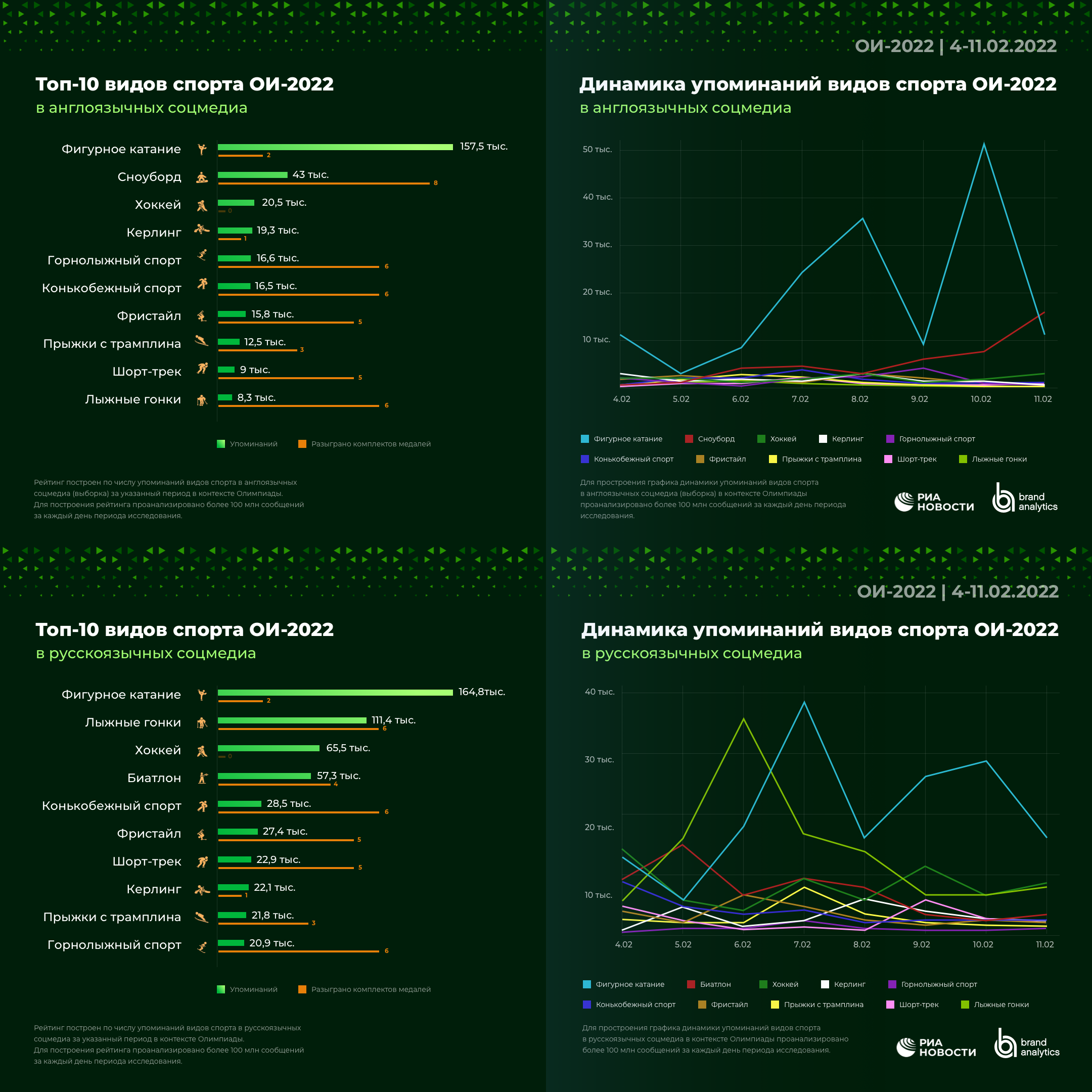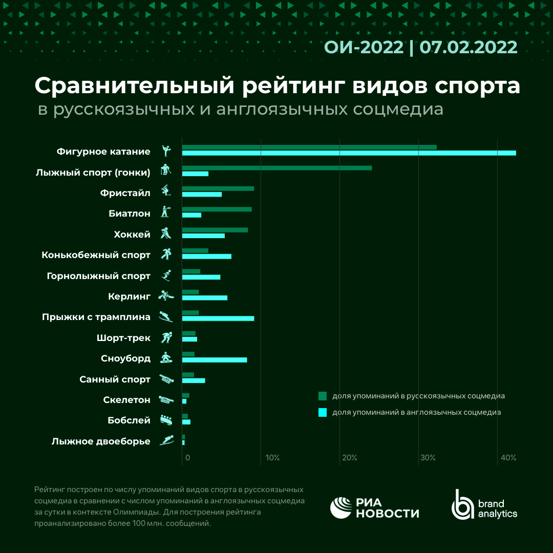 Доля упоминаний фигурного катания с большим отрывом превалировала как среди русскоязычных, так и у англоговорящих пользователей соцмедиа. Пользователи активно следят за ходом соревнований одного из самых зрелищных видов спорта: Как минимум, потому что это красиво. Фигуристы приобретают популярность, сравнимую с известными блогерами: куча фанатских видео в TikTok, которые набирают миллионы просмотров всего за день, тому прекрасное подтверждение.