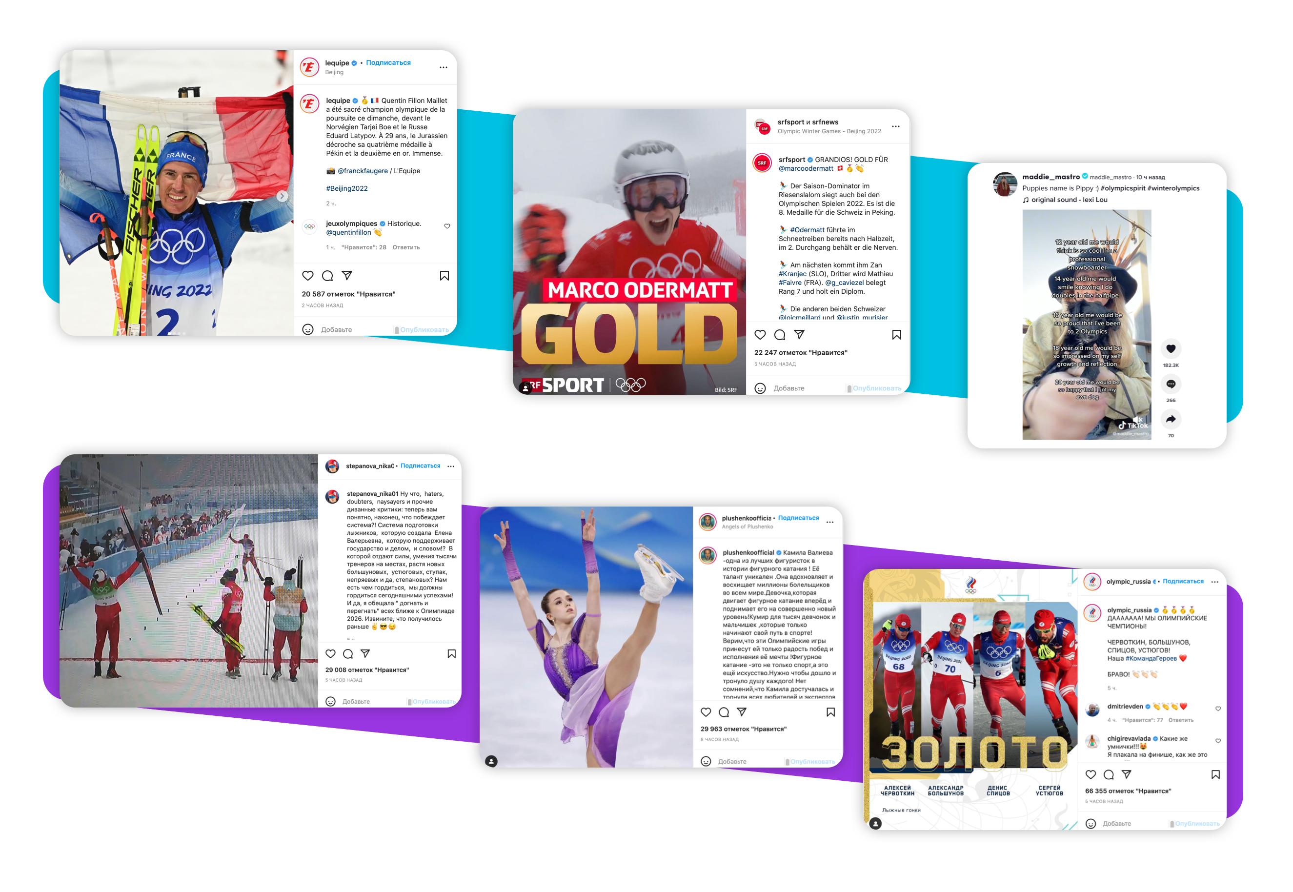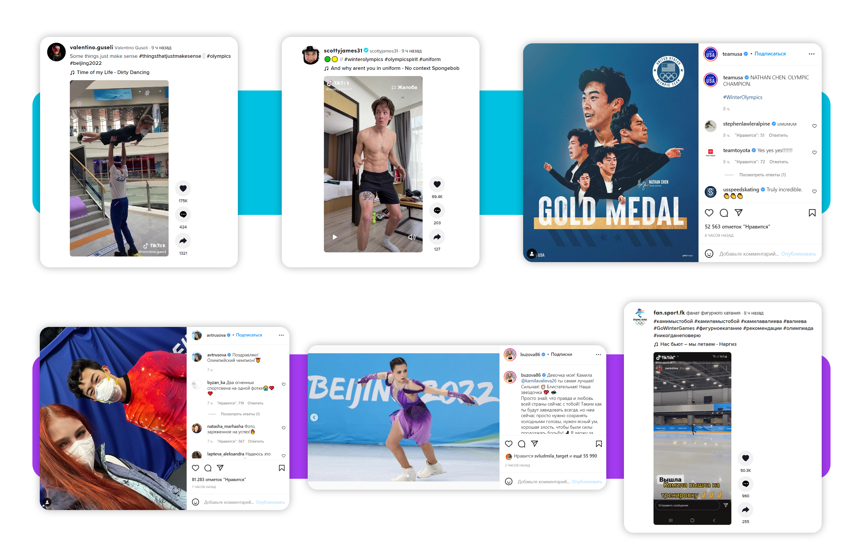 Также большую вовлеченность набрал пост Александра Большунова в Instagram, где спортсмен с гордостью объявил о том, что он - Олимпийский чемпион: у поста более 107 тыс. лайков и сотни комментариев за 3 часа с момента публикации. В TikTok-аккаунте «Команда Тутберидзе» видео с выступления Камилы Валиевой набрало более 500 тыс. просмотров, а количество лайков превысило 50 тыс.