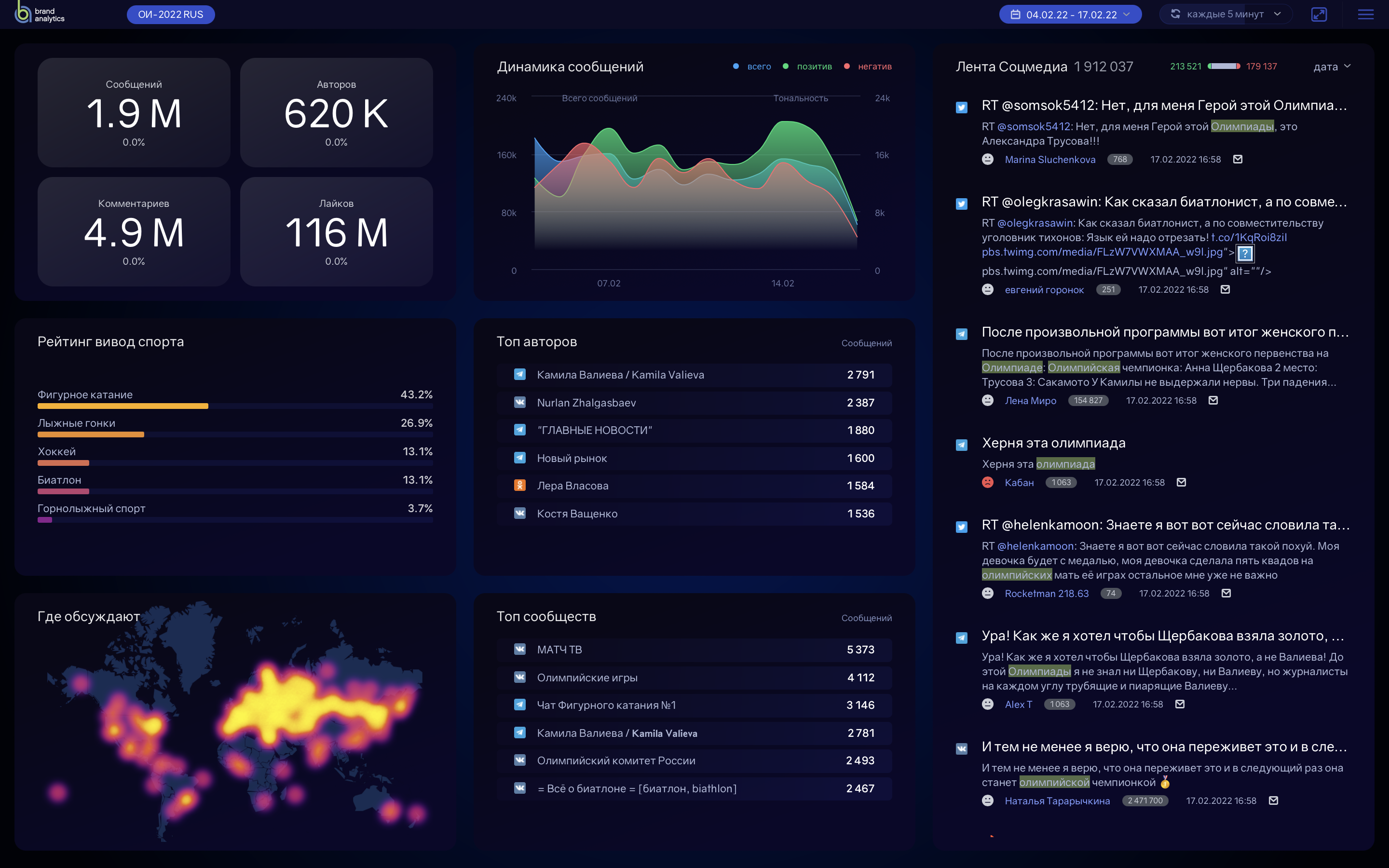 Особенно актуальны дашборды сегодня, 17 февраля – ведь сегодня финал личных соревнований по фигурному катанию у женщин. Теперь вы имеете возможность не только следить за ходом финала по ТВ, но и одновременно видеть как люди реагируют на ход финала и после обсуждают его результаты.