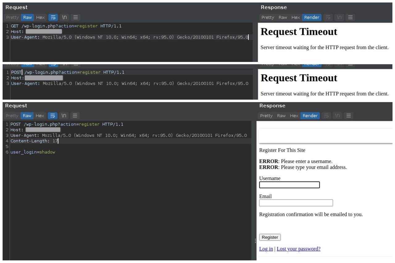 /wp-login.php?action=register, для которого есть даже соответствующий шаблон в nuclei. Однако, не всегда стоит слепо полагаться на подобные инструменты. На скринах ниже эндпоинт, для которого этот шаблон не отработал. Дело в том, что nuclei в этом шаблоне пытается отправить