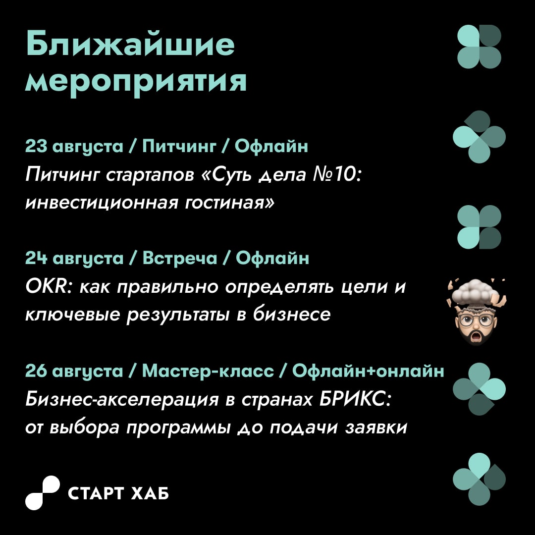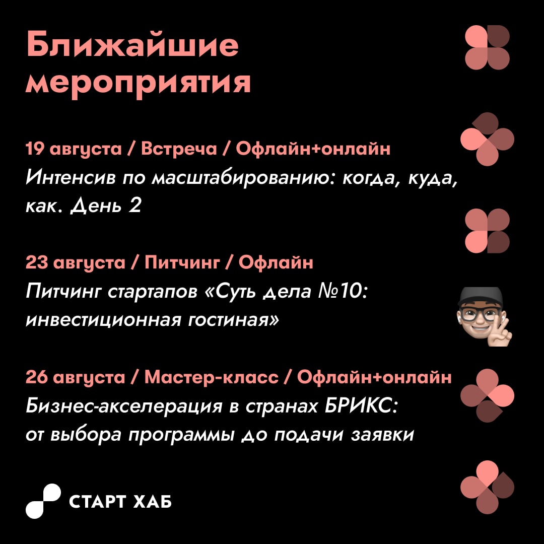 👉🏻26 августа. Мастер-класс «Бизнес-акселерация в странах БРИКС: от выбора программы до подачи заявки». На мероприятии мы поговорим о том, как правильно подойти к выбору акселератора и обсудим разные нюансы — от заполнения заявки до сложностей, с которыми можно столкнуться. А также разберем кейсы российских стартапов, которые прошли через зарубежные акселераторы и готовы рассказать о своем опыте.