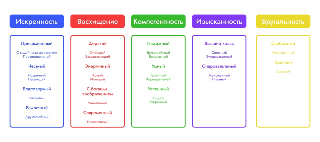 Дженнифер Аакер, психолог и профессор Стенфордского университета, вывела модель индивидуальности бренда на основе своего исследования. По результатам эксперимента сложилась модель индивидуальности бренда — она показывает взаимосвязь между фирменным цветом и впечатлением, которое он производит на аудиторию. Аакер считала, что люди делают выбор в пользу компаний, близких им по духу.