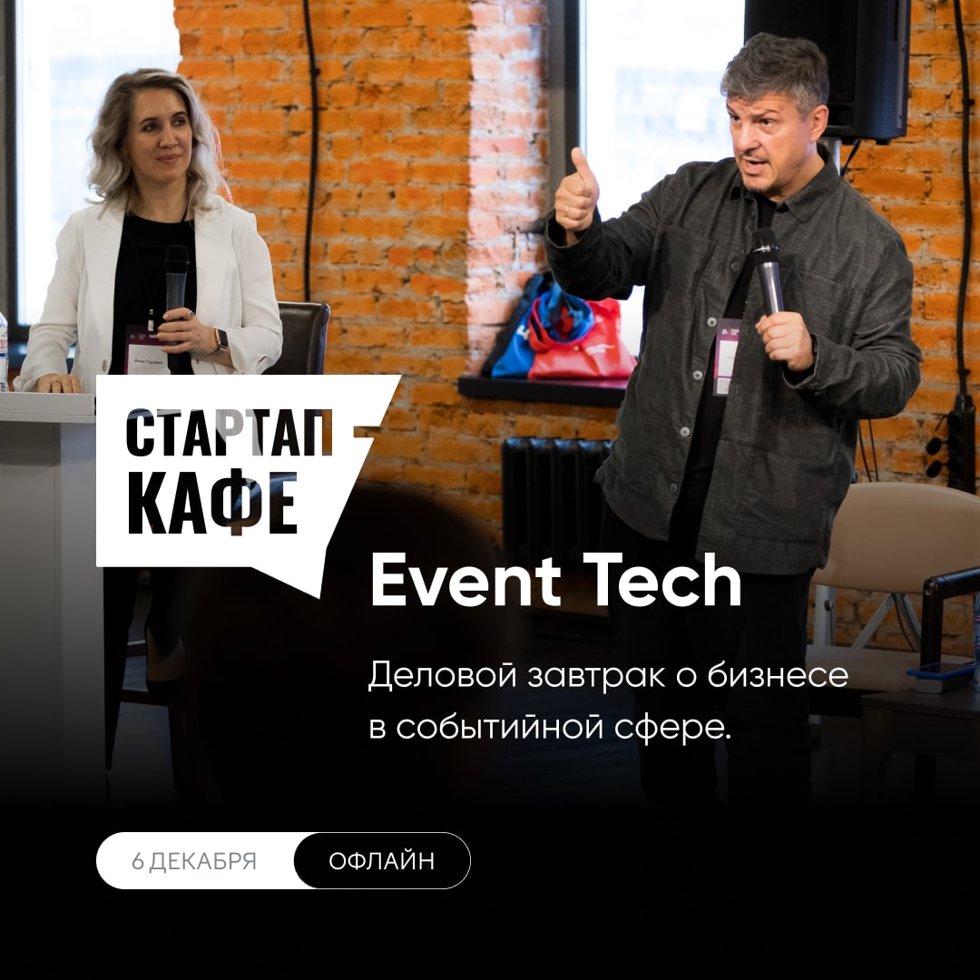 6 декабря не пропустите Стартап-кафе: EventTech — деловой завтрак о бизнесе в событийной сфере. Вместе с участниками рынка обсудим текущий уровень развития и будущее сферы EventTech в России. Также вы сможете посетить интерактивную выставку и познакомиться с российскими технологическими компаниями.