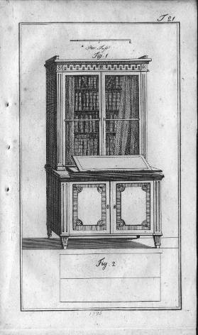 Всякая благовоспитанная женщина, обладающая культурой, верно, имеет некоторое число любимых книг и любимых писателей для развлечения и в качестве пищи для своего ума в часы уединения, и, стало быть, может, не рискуя приобрести невыгодную репутацию той, что разыгрывает роль ученой жены, иметь в своей комнате небольшой книжный шкаф, где хранятся ее литературные любимцы, а ежели она любительница искусства, - то и рисунки и гравюры. Само собою разумеется, что такая небольшая дамская библиотека должна быть красивым, удобным и приятным предметом обстановки. На илл. 21 мы даем эскиз такой библиотеки, а именно вид спереди на рис. 1 и вид сверху на рис 2. Верхняя половина книжного шкафа — с двумя застекленными дверцами и зелеными шелковыми занавесями за стеклом. Нижняя часть — еще один, столь же поместительный благодаря своей глубине, шкаф с двумя дверцами и тремя пустыми ящиками для гравюр, рисунков и музыкальных сочинений. Между обоими шкафами выдвигается полка с подставкой для чтения, которую можно установить, чтобы, к примеру, рассматривать издание гравюр ин кварто или ин фолио, с удобством его перелистывая. Собственный выбор обладательницы определит, из какого дерева надлежит изготовить сей элегантный предмет обстановки».