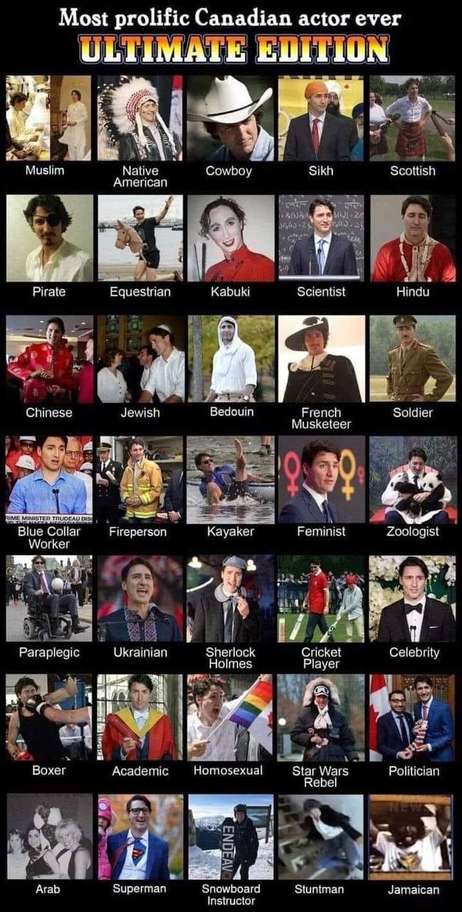 Джастин Трюдо - зачётный левацкий клоун и климаталармист. Его чёрным дружкам из BLM наверняка особенно нравится фотка в левом нижнем углу, где он использует блэкфейс на вечеринке несколько лет назад для разжигания расизма.