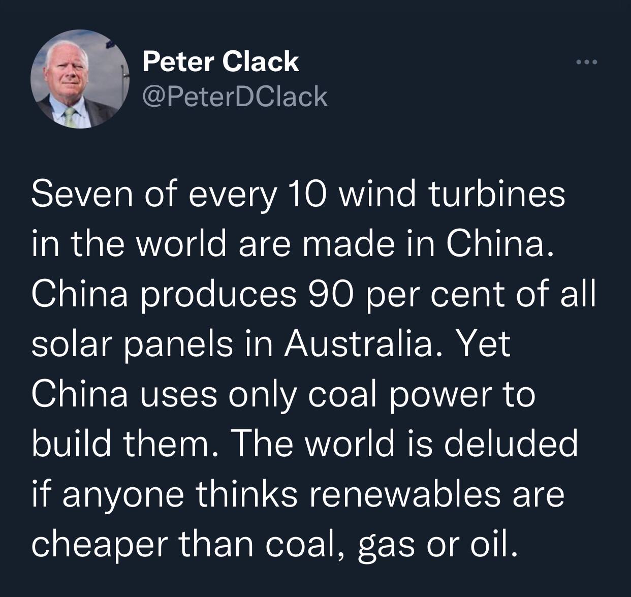 Китай производит 90% всех солнечных батарей, используемых в Австралии. Тем не менее Китай использует для их строительства только угольную энергию. Мир заблуждается, если кто-то думает, что возобновляемые источники энергии дешевле, чем уголь, газ или нефть.