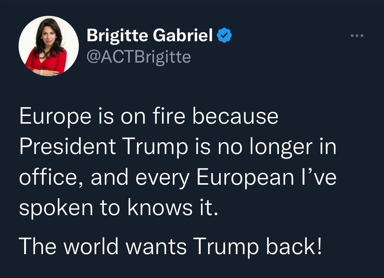 Европа в огне, потому что президента Трампа больше нет у власти, и каждый европеец, с которым я разговаривала, знает об этом.