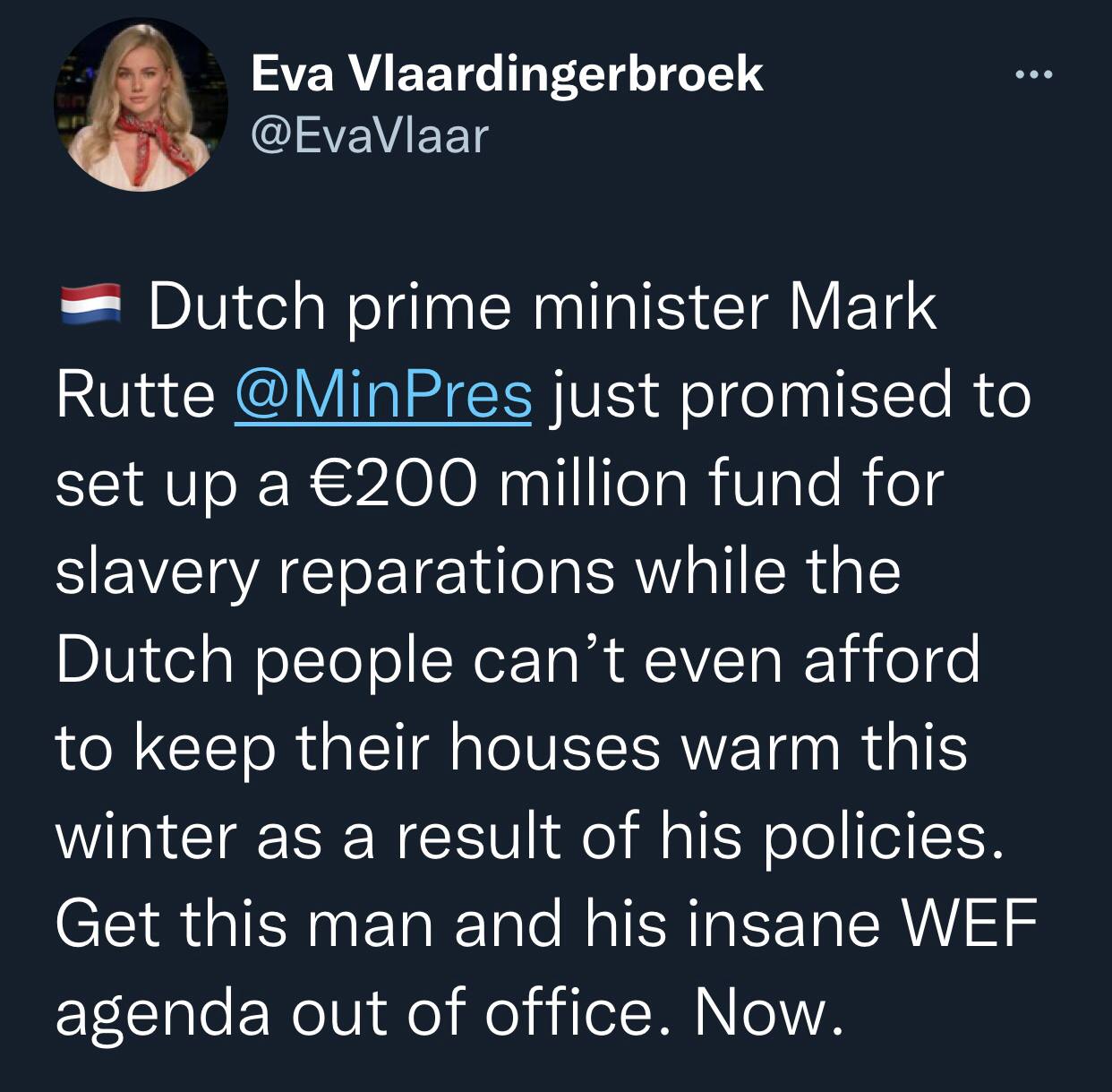 Премьер-министр Нидерландов Марк Рютте только что пообещал создать фонд в размере 200 миллионов евро для репараций за рабство, в то время как голландский народ даже не может позволить себе содержать свои дома в тепле этой зимой в результате его политики. Уберите этого человека и его безумную повестку ВЭФ. Сейчас.